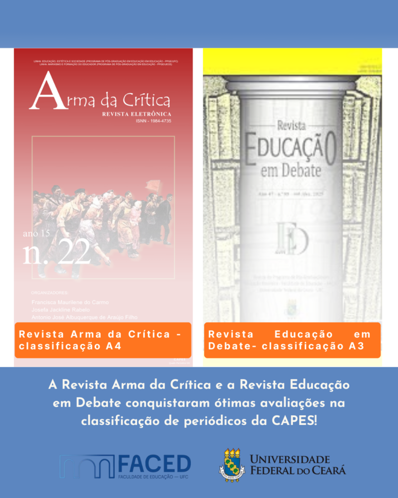 A Faculdade de Educação parabeniza às docentes e editoras das revistas científicas da FACED pelo excelente resultado na última avaliação de periódicos científicos. Ressaltamos os docentes editores : Fátima Nobre ( Revista Educação em debate), Jackeline Rabelo, Francisca Maurilene do Carmo, Maria das Dores Mendes, Valdemarin Coelho e Helena de Araújo ( Revista Arma da crítica). Ressaltamos o compromisso com a produção científica e com a universidade pública.
